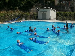 子どもたちは服を着てプールに入ると、「体が重い!!」「泳ぎづらい!!と水着で泳ぐ時との違いに驚いていました。