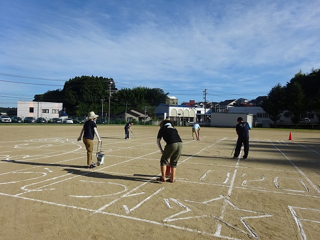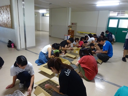 下絵を描く人、キャンドルのコップにろうそくを入れる人、それを運動場まで運ぶ人、皆さんの協力で暑い中でしたが明日の本番に向けてしっかり準備ができました。