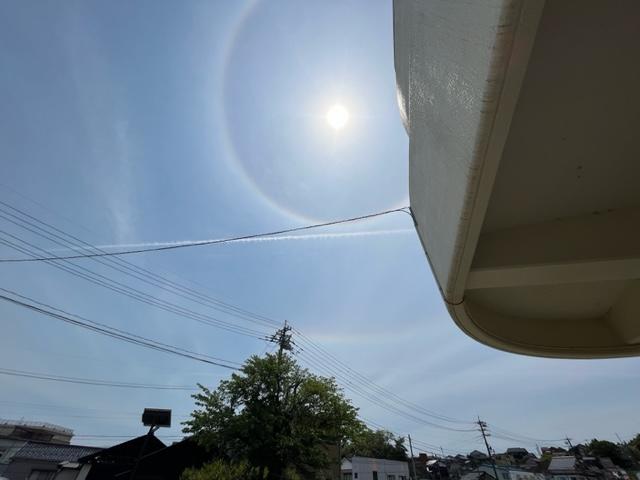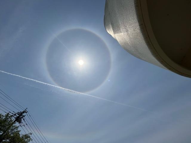 ふと校長室から空を見上げると、太陽のまわりにきれいな円形の虹が2重に見えました。