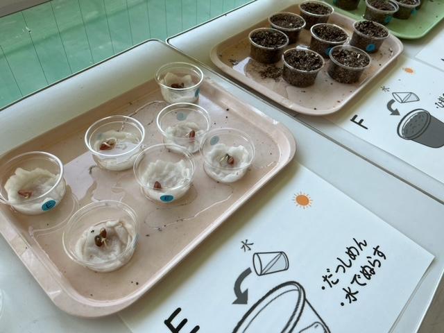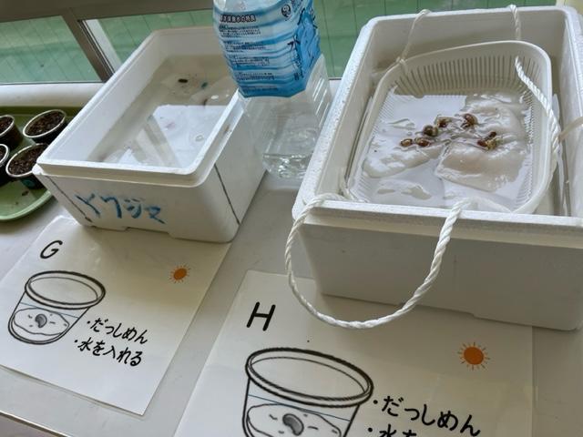 廊下には、理科の実験中の種子が発芽していました。宇出津小の新たな芽吹きを感じます。
