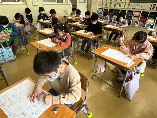 計算を終えた児童は、えんぴつを置き、静かに待っていました。