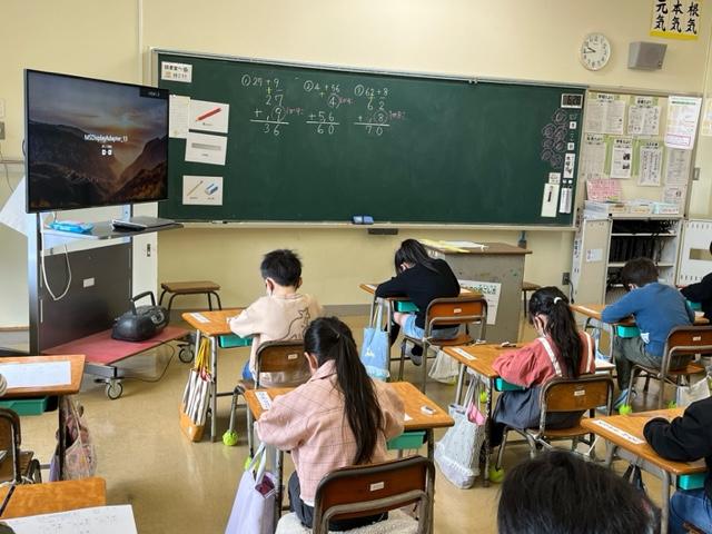 2年生の算数の授業。2ケタの数字が並んでいました。繰り上がりが入り、難しくなっていきますね。