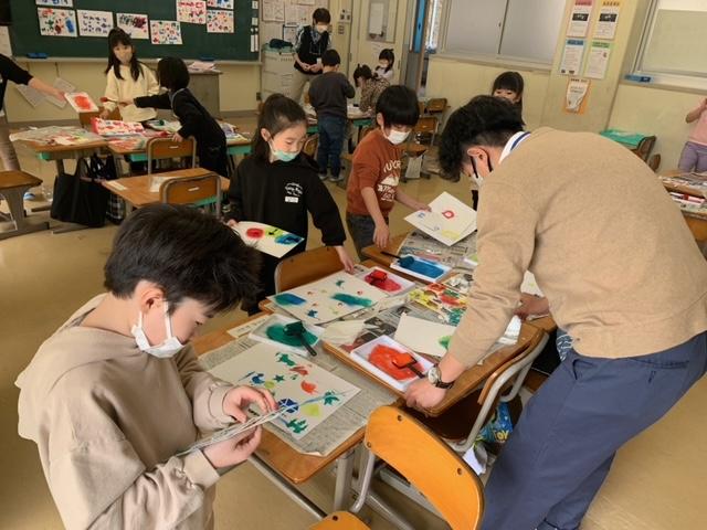 写真は、今日の5年生の体育と1年生の図工の時間のようすです。