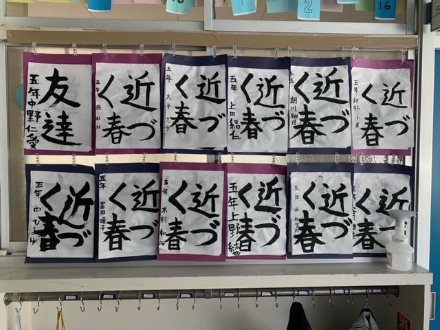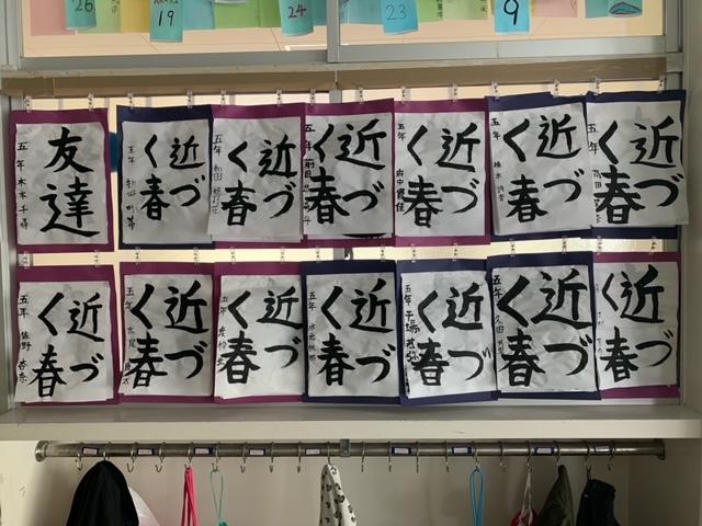 5年生の教室横の廊下には、書写の授業で書いた『近づく春』が飾ってありました。