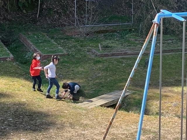 なかには、流れている小川に手を突っ込んで、何かを捕まえようとしている児童もいました。