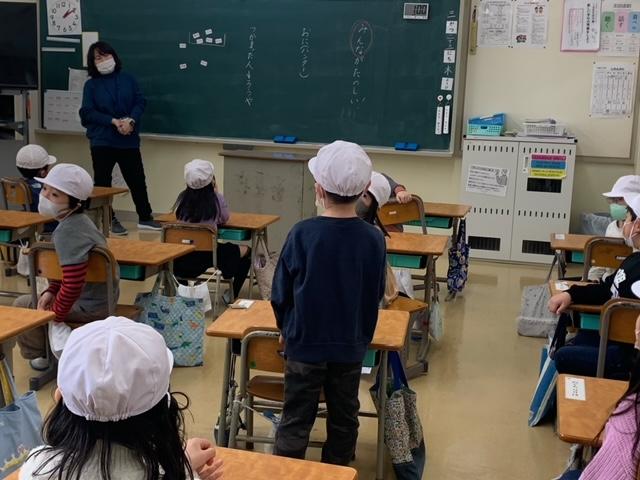 1年生は、作った作品をお互いに見せ合いっこをしていました。