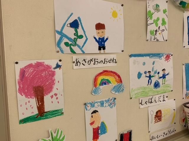 教室の後ろには1年間の思い出の絵が飾られていました。