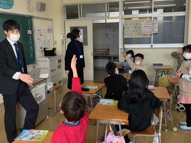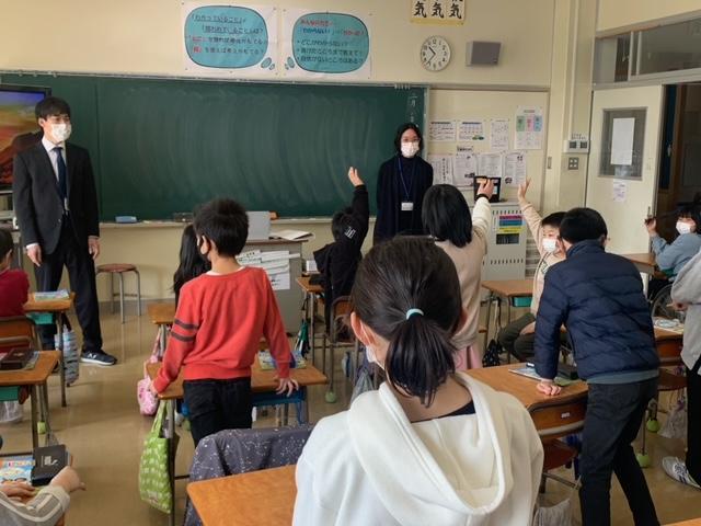 エイミーさんからの英語での質問に、手を挙げて英語で答えている児童。