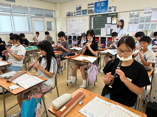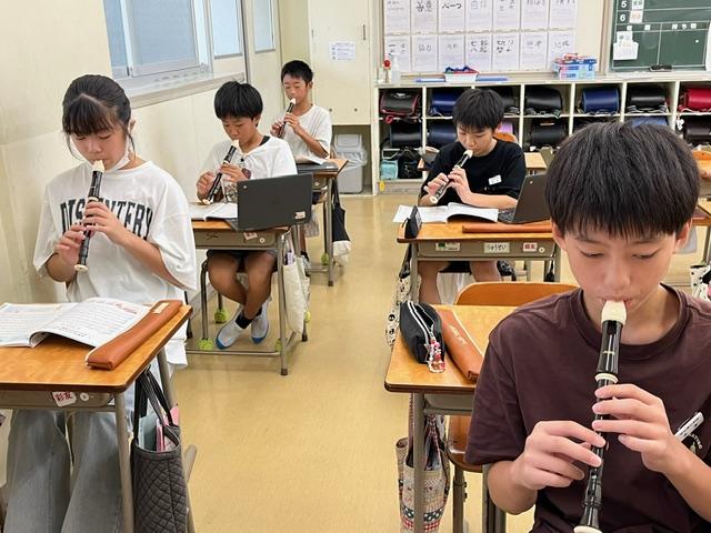 6年生は、リコーダーの演奏に取り組んでいました。多くの仲間と奏でる音が重なると、きれいな音色になります。指使いと息の強さが大切ですね。