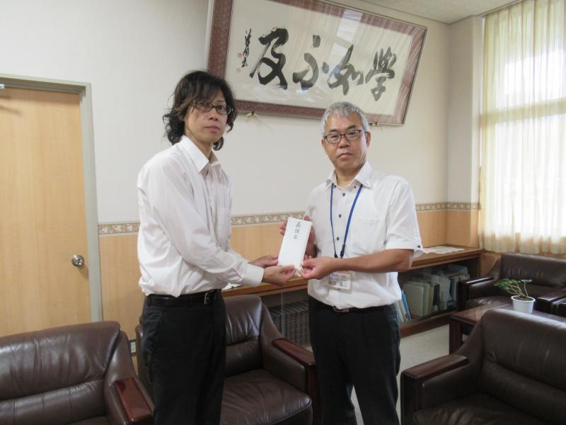 宇出津小学校出身で、金沢にお住いのシンガーソングライター西和男さんを通して、義援金をいただきました。このひどい雨の中、金沢から日帰りで届けにきてくれました。