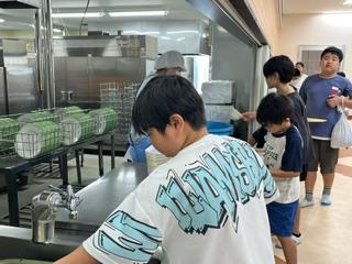 最後は、後片付け。牛乳パックをたたみ、食器を重ねています。輪番制で、台の上や床の上を拭いたら、近くの先生にチェックしてもらいます。