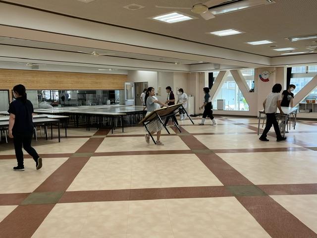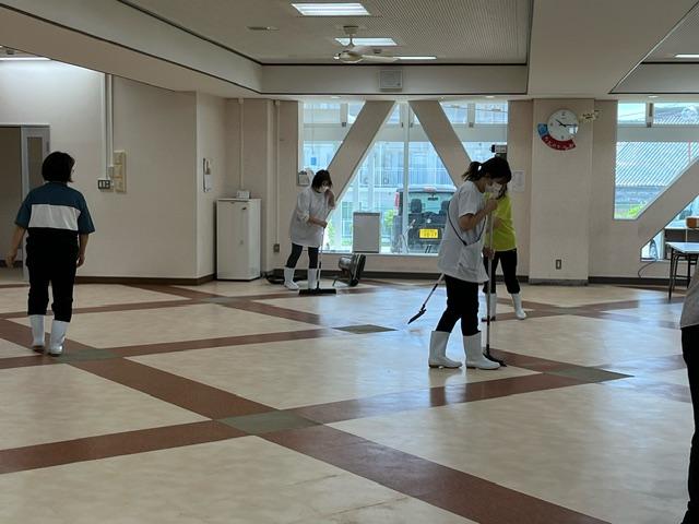 今日は、ランチルームのワックスがけをしました。給食調理員の方と職員が一緒にテーブルを運んで、ランチルームをきれいにしました。
