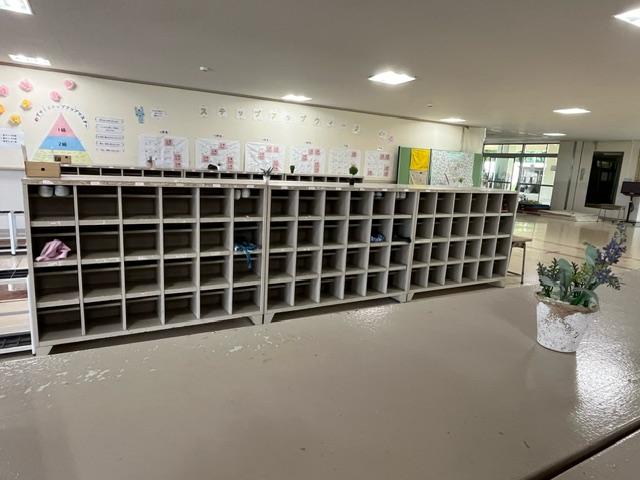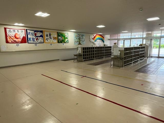 さて、写真は今日の児童玄関等のようす。とても静かで、がら~んとしています。学校閉庁期間を終え、窓を開けて熱風処理?