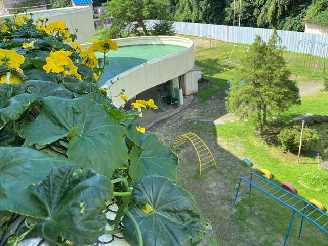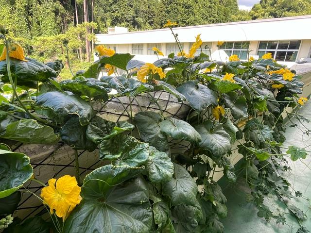 勢いよくヘチマが2階から3階まで伸びています。どれが雌花で、どれが雄花かな。
