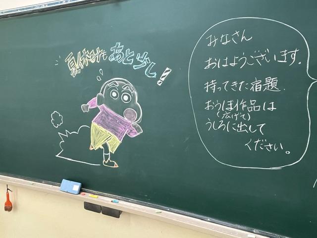 登校して、久しぶりに会う友達、先生と和やかに話をしていました。教室の黒板には、担任からのメッセージが書かれていました。