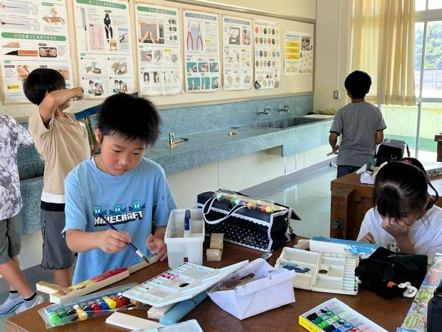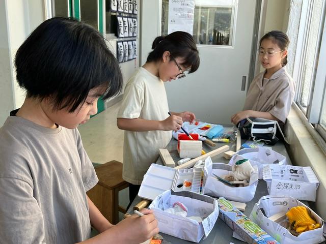 のこぎりで木を切り、くぎを使ってつなぎ合わせたり、動くように工夫したり・・。最後は、絵の具で色塗り!