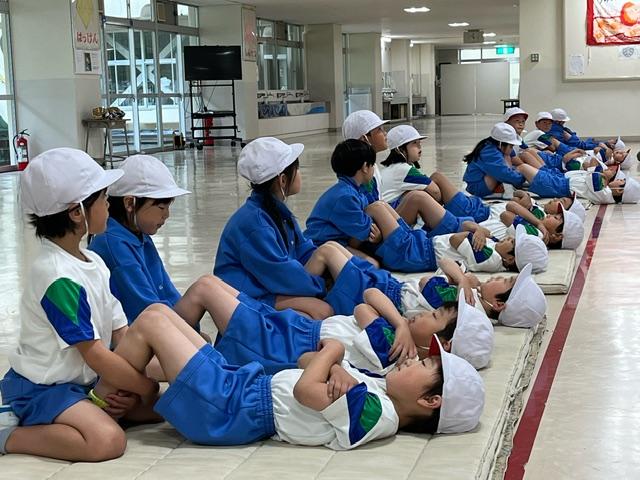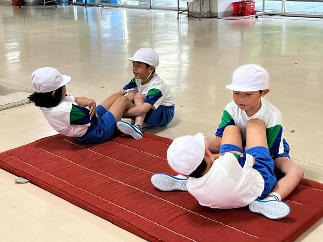 給食の前でお腹がすいていても、1年生は上体起こしを一所懸命にやっていました。