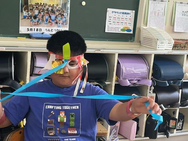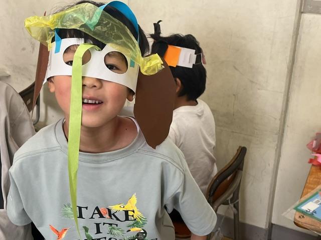 なかには尻尾をつけている児童もいました。仮面やベルトを着けるとヒーローになった気分ですね。