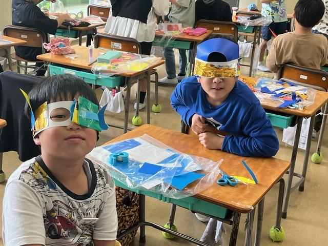 はさみやのり、輪ゴムを使って、仮面やベルト等を作っていました。