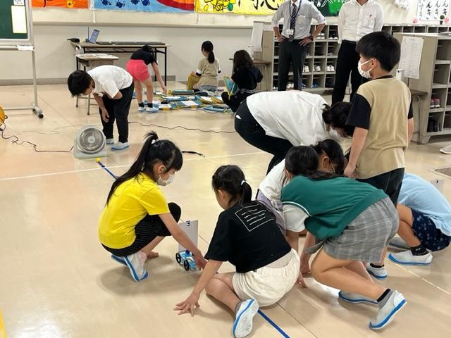 今日は、児童玄関で、風の大きさとものの動く距離との関係について、調べていました。