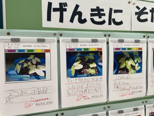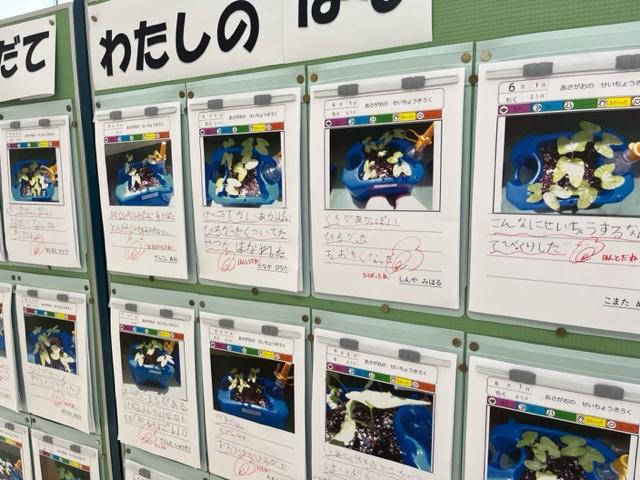1年生の教室横の広い廊下には、アサガオの成長の様子が掲示されていました。