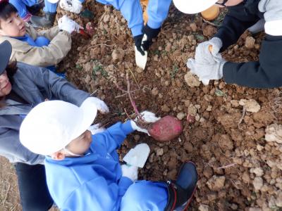 ラグビーボールほどもあるサツマイモがほれました!カゴいっぱいにとれたサツマイモから、袋いっぱいのお土産をいただき、子どもたちは大満足でした。日本海倶楽部ザ・ファームのみなさま、本当にありがとうございました!