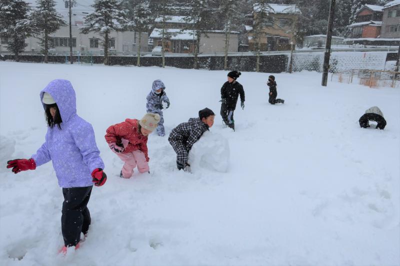 校庭に降り積もった雪で、雪遊びをしました。