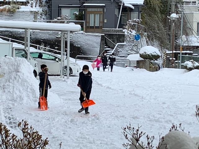 最近、宇出津っ子数名が、大きなスコップを片手に、自ら児童玄関前の除雪を手伝ってくれています。