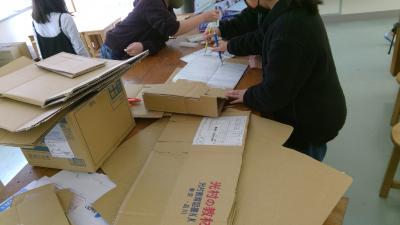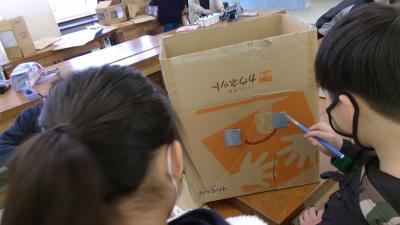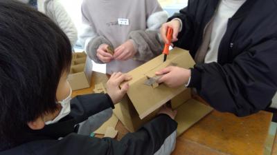 段ボールカッターの扱いに苦戦しながらも、グループごとに協力して
