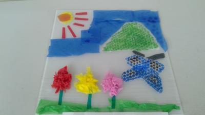 ちり紙やシールを切ったり、丸めたりして、透明な段ボールに貼る作業を進めていきます。