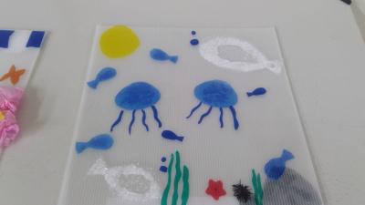 一人ひとりが様々な工夫をして、海の中や野原の様子を表していました。また、光を差してかざすと見え方が変わります。