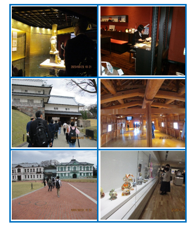 箔一本店(箔巧館)では箔打ちの工程を学び、前田利家公の金の甲冑(レプリカ)を見学しました。金沢城公園(菱櫓・五十間長屋・橋爪門続櫓)では、釘を使わない昔ながらの工法で作られた城内を自由に散策した後、ボランティアガイドの案内で石垣や櫓の形についての説明を聞きました。国立工芸館では、ポケモン工芸展が開催されており、ポケモンの姿かたちの作品からしぐさ、気配まで感じる作品が展示されていて、生徒たちはドキドキ、ワクワクしていました。