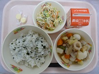 筑前煮には、ごぼう、にんじん、こんにゃく、たけのこなど、サラダには、切り干し大根とさきいかを使いましたいつもよりかむ回数が増えているといいなと思います