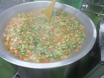 家で食べるおひたしは、ゆでた野菜にしょうゆをかけて食べることが多いと思いますが、学校では、しょうゆ、みりん、だしを一度煮たてて、冷蔵庫で冷ましておき、ゆでて冷ましておいた野菜と和えて出しています