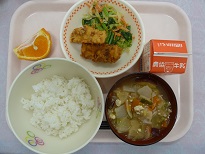 今日は、小松菜、キャベツ、にんじんを白すりごま、さとう、しょうゆで和えましたくだもののしらぬいもジューシーで美味しかったです