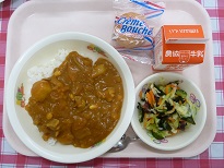 体に良くて、栄養満点の大豆をカレーに入れて食べやすくしましたデザートはクリームブッセです。ブッセとは、フランス語で「ひとくち」という意味だそうで、一口サイズのデザートでした