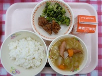 鶏肉、しめじ、にんじん、たまねぎ、ピーマンを具に、しょうゆ味で仕上げました残食もほとんどゼロでした