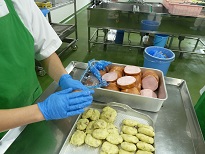 ・白みそ、マヨネーズ、みりん、三温糖で味付けし、紙カップに詰めます。