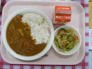 お肉のカレーとは、また違った味わいがあります サラダにはサラダ用の寒天が入っていますちゅるちゅるした食感が楽しかったです