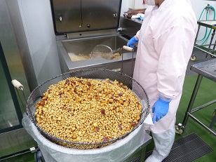 ・米粉と片栗粉を混ぜた衣をまぶして、大豆とさつまいもを揚げる