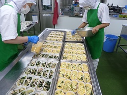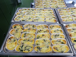 ハム、玉ねぎ、エリンギ、ほうれん草をにんにくとともにオリーブオイルで炒めたものをカップに詰め、卵、生クリーム、牛乳を合わせた液を注ぎ、とろけるチーズをのせて焼きました 初めてメニューでしたが、チームワークで美味しく作ることができました
