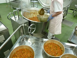 ジャンバラヤはウインナー、えび、にんじん、たまねぎ、二色のピーマン(赤、緑)をトマトとカレー味で味付けした具を、麦入りごはんに混ぜて作っています