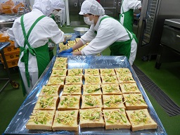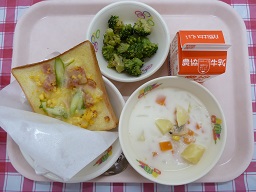 今日は、町野産のグリーンアスパラガスを使ってトーストを焼きました厚切り食パンにマヨネーズを薄く塗り、ベーコン、たまご、アスパラをのせ、とろけるチーズを散らして焼きます焼きあがったら、パン袋に入れて配缶します