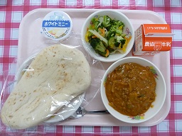 今日はナン&キーマカレーでしたひとくちずつナンをちぎってキーマカレーをのせて食べましたデザートはカレーにも合うレアチーズ味のホワイトミニーでした