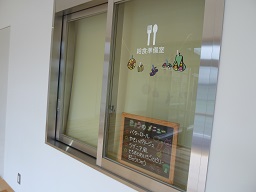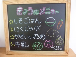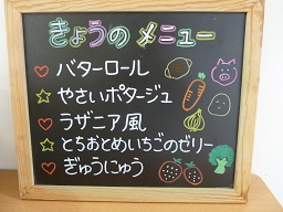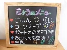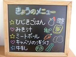 給食室の入り口前にメニューボードを置いてみました