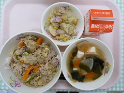 チキンライスは学校で煮た具を、ごはん屋さんから届いた麦ごはんに混ぜて出しています鶏肉の他にベーコンを少し入れることで、味にコクがプラスされています