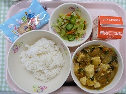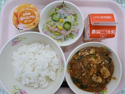 ごはん、マーボーどうふ、春雨サラダ、みかんゼリー、牛乳