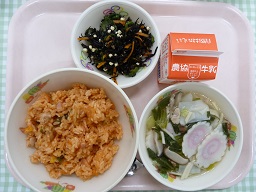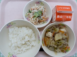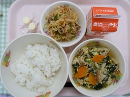 今日は中華風のメニューの日でしたサンラータンは酸味のきいたスープです中華風のあえものには、下味をつけて煮て冷ましておいた、焼き豚ときくらげが入っていて、ボリュームのあるあえものです
