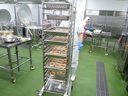 ハムエッグは、朝ごはんに食べることが多い料理ですが、給食でも作ってみましたカップに半月切りのハムをしいて、その上に卵を落として、スチームコンベクションで蒸します蒸しあがったところに、パセリをふって出来上がりです