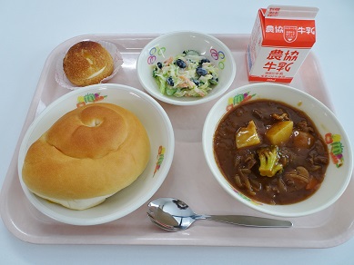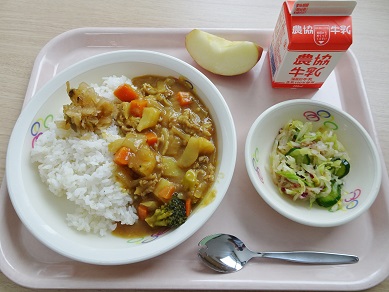 牛乳、ポークカレー、うめおかか和え、フルーツ、福神漬け